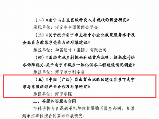 近日,南宁市科学技术协会下达了2020年南宁市科协调查研究软课题立项通知,经审定,共5个课题获得立项。其中,我校会计与审计学院卢雯君老师组织申报的《中国(广西)自由贸易区建设背景下南宁市与东盟旅游产业合作及对策研究》项目获得立项。