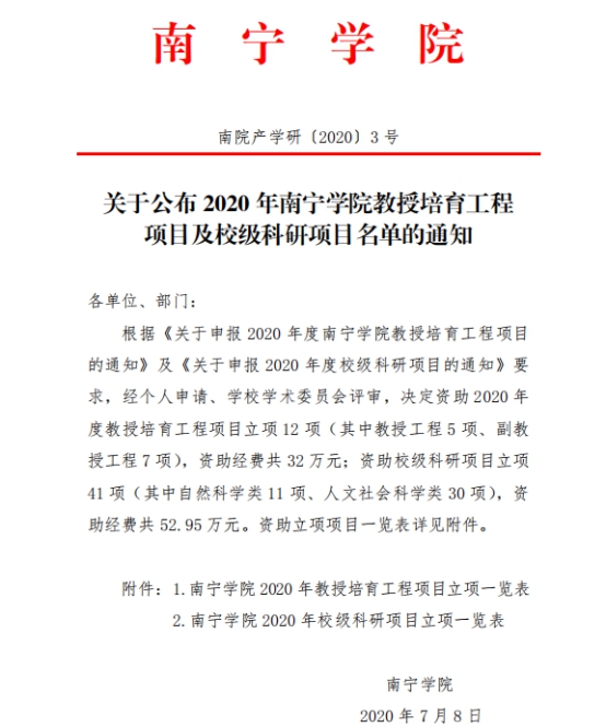 产学研处张艳雯副主任向学校学术委员会对2013-2019年立项情况及2020年项目申报组织情况进行详细汇报。根据《关于申报2020年度南宁学院教授培育工程项目的通知》及《关于申报2020年度校级科研项目的通知》的文件要求,经学术委员会讨论决定资助2020年度教授培育工程项目立项12项(其中教授工程5项、副教授工程7项),资助经费共32万元;资助校级科研项目立项41项(其中自然科学类11项、人文社会科学类30项),资助经费共52.95万元。