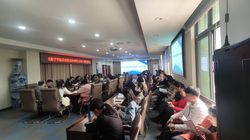 为进一步推进我校新阶段科研工作的开展,12月22日下午,《南宁学院科研基金管理暂行办法》解读会在行政楼322召开,产学研处张艳雯处长、各二级学院分管科研副院长、科研秘书、教师代表参加会议。会议由产学研处张艳雯处长主持。
