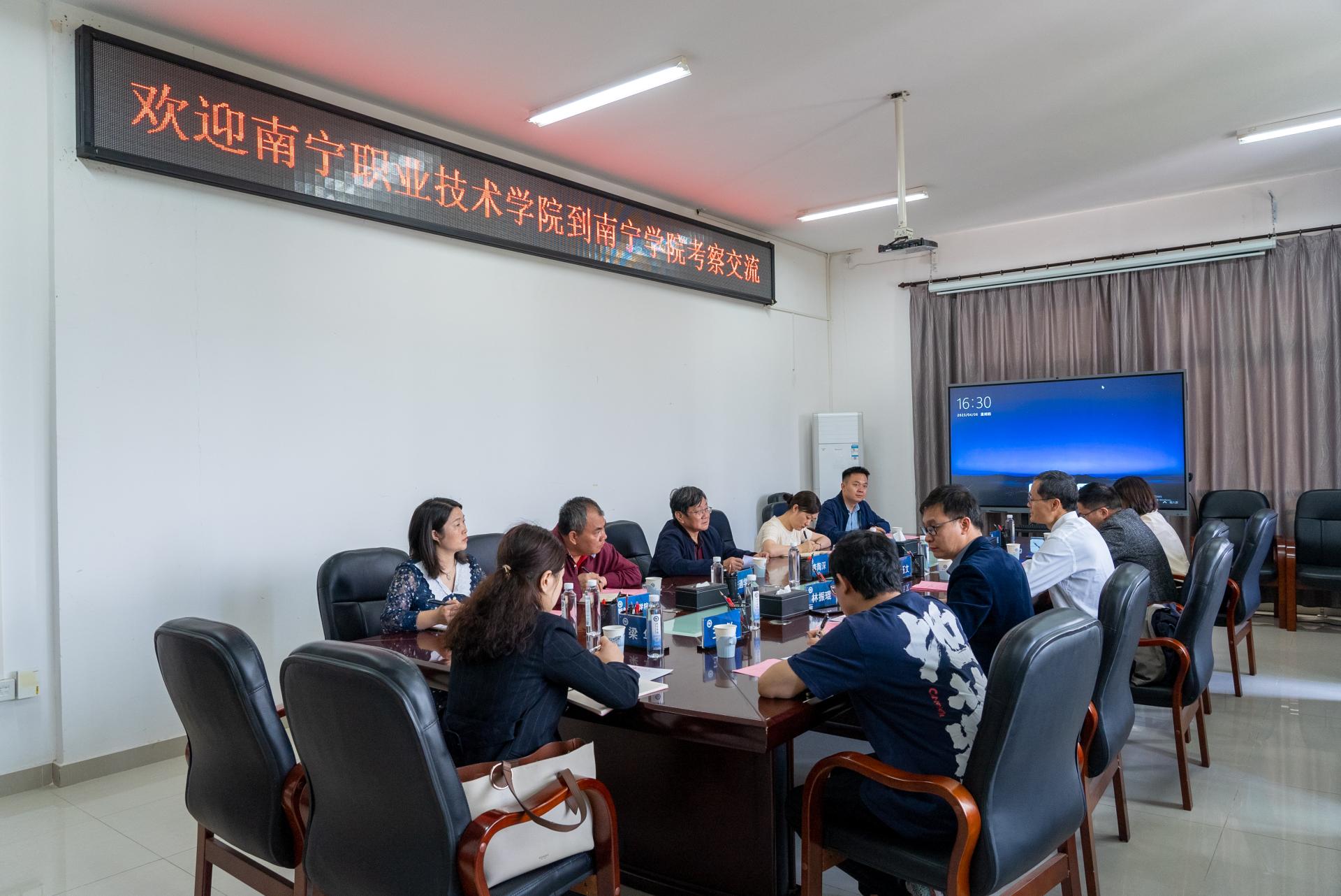 参观结束后,双方在行政楼518召开了座谈会,李陶深副校长欢迎南宁职业技术学院到南宁学院考察调研,介绍了南宁学院发展情况,重点介绍了广西中国-东盟综合交通国际联合重点实验室、硕士点培育建设、科研平台、科技服务等方面的情况。万玉文副校长对南宁学院的热情接待表示感谢,重点介绍了南宁职业技术学院“双高建设”、升本工作等情况,希望两校在科研发展、科研平台、科技创新等方面开展深入的交流合作。会上,张艳雯处长介绍了南宁学院科研政策、科研管理等方面情况。
