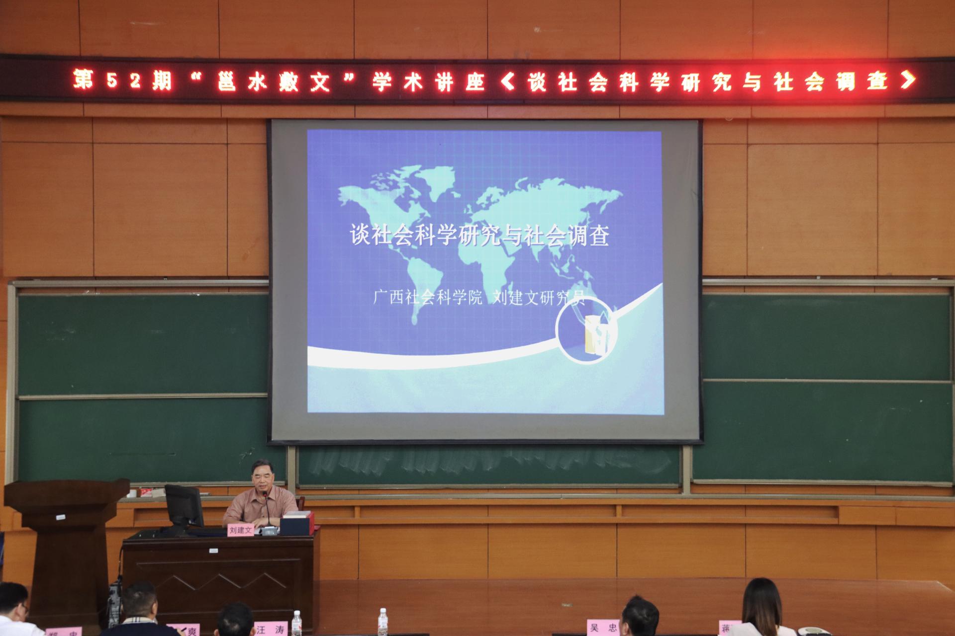 签约仪式结束后,接着进行南宁学院第52期“邕水敷文”学术讲座。此次讲座由刘建文研究员做《谈社会科学研究与社会调查》的专题报告。讲座中,刘建文老师结合自身多年丰富的科研与社会调查经验着重从自己的社会科学研究之路、对于社会科学研究的看法以及社会调查在社会科研研究中的作用等三个方面进行了详细全面的讲授。刘建文老师指出,社会调查是当前社会研究中的重要方法,在社会科学诸多学科中得以应用,社会调查能够准确地测量社会现象,了解民情民意,可以分析社会现象之间的联系探究成因,还可以预估未来条件下社会现象的发生可能性以及能够为制定相应的社会政策提供参考。本次讲座体现了较强的理论性和实操性,让在座师生收益匪浅,现场学术氛围浓厚,师生们纷纷以热烈的掌声以示讲座的精彩。