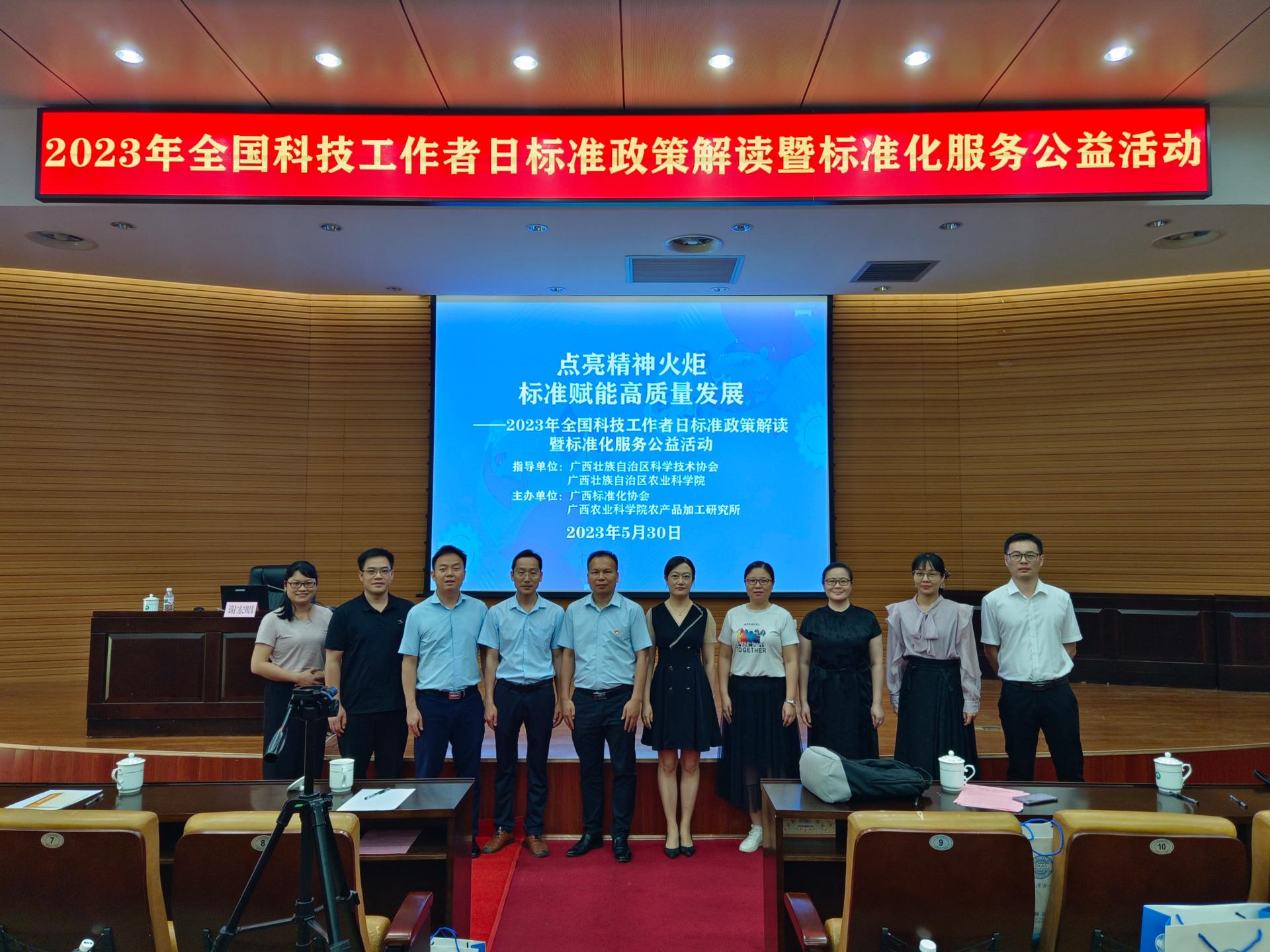 2023年5月30日是第七个“全国科技工作者日”,南宁学科研与学科建设处组织老师们参加了全国科技工作者日标准政策解读暨标准化服务公益活动,活动由广西标准化协会联合广西农业科学院共同主办,主题为“点亮精神火炬 标准赋能高质量发展”。南宁学院科研与学科建设处处长张艳雯教授、副处长姚锦金副教授,交通运输学院副院长范毅教授、庞彦知副教授等广西标准化专家库专家、广西科学传播专家库专家共9人参加了本次活动。