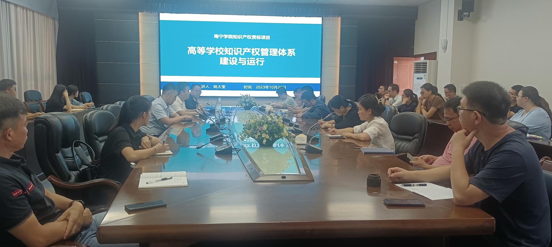 为推进学校知识产权管理体系建设工作,提高学校广大教职工及学生创新意识和知识产权保护意识,提高学校知识产权创造、运用、保护和管理水平,南宁学院于2023年10月26日举办知识产权管理体系培训。培训由科研与学科建设处姚锦金副处长主持,广州科创知识产权咨询有限公司姚大奎副经理讲授,北部湾产权交易中心市场部陈健副经理、各二级学院分管科研副院长、科研与学科建设科负责人、专利骨干教师、各行政部门教师代表、学生代表参会。