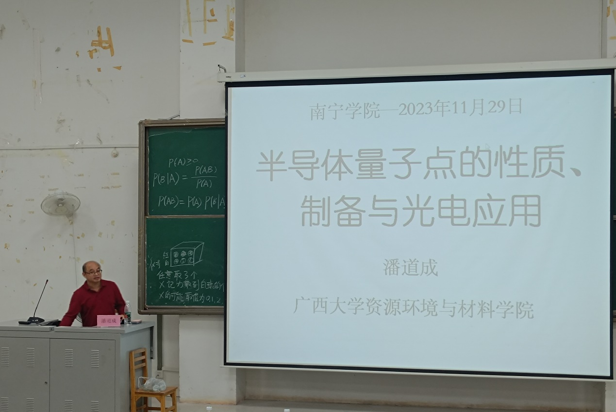 为了培养学生综合能力、拓宽学术视野,提升学生发现问题、分析问题、解决问题的能力,11月29日,智能制造学院物理教研室邀请了广西大学资源环境与材料学院潘道成教授作主题为《半导体量子点的性质、制备与光电效应》的专题学术讲座,讲座由物理教研室主任唐帆斌主持,学院师生代表共计100余名参加。