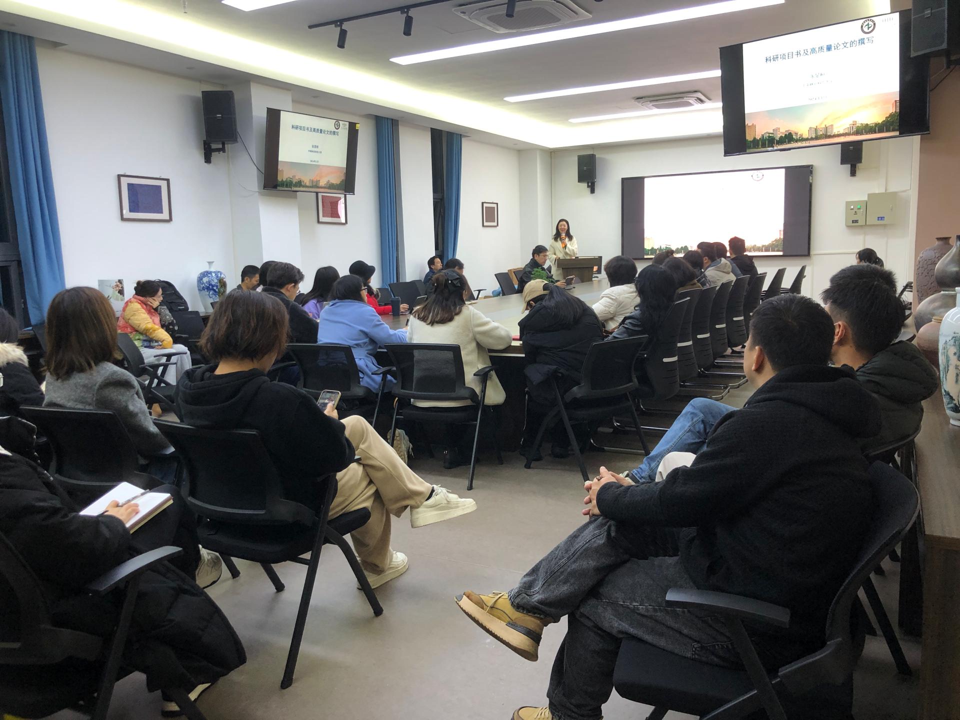 张旻桓教授首先介绍科研项目书的相关要求,对省部级社科项目立项难的原因逐项分解、指导。张旻桓教授认为确保清晰、简洁地表达研究内容,并使用正确的科学术语和逻辑结构是撰写项目书的重点。她指出好的选题是成功的一半,立题直接决定成败,在选题方向上,要结合国家政策和社会需求,以及关注往年立项的选题以确保选题的独特性和创新性。同时还应当遵循指定的格式和模板。她鼓励大家在新的一年,在社科项目申报上更上一层楼。随后,张旻桓教授还对论文的撰写进行指导,她对比了中英文期刊的撰写要求,鼓励大家拓宽国际视野,产出高质量的国内国际论文。