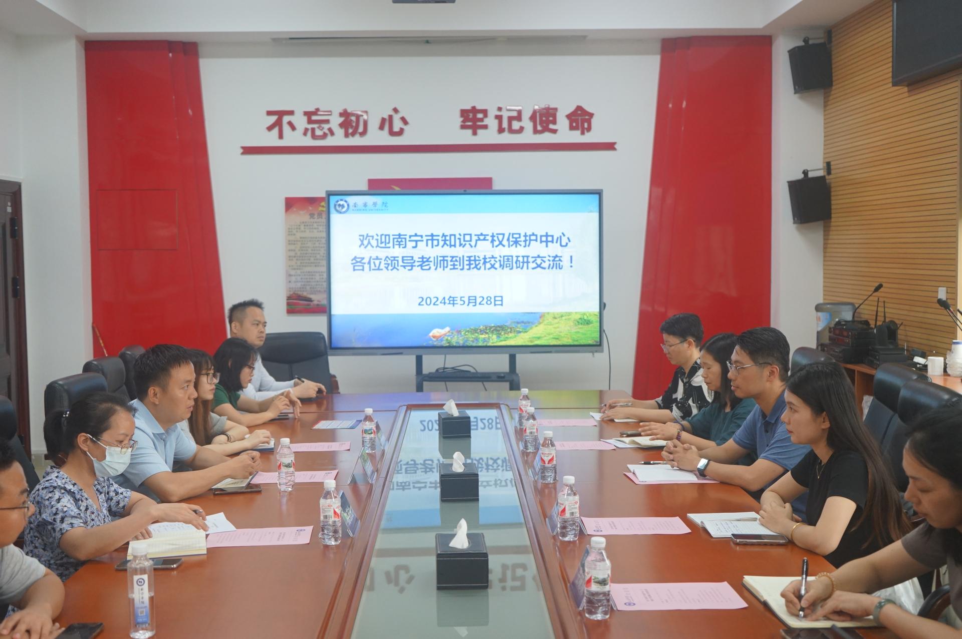 2024年5月28日下午,南宁市知识产权保护中心周锋主任一行5人到南宁学院座谈交流,座谈交流地点在行政楼514会议室,座谈交流会由南宁学院科研与学科建设处姚锦金副处长主持,南宁市知识产权保护中心负周锋主任、张味味知识产权师,中国知识产权出版社刘柳高级知识产权师、刘春燕经理,广州三环专利商标代理公司艾丽红经理,科研与学科建设处科研管理科陈芸生科长、黄韵潼老师以及新能源、新材料领域专利一线技术团队人员参加座谈交流。