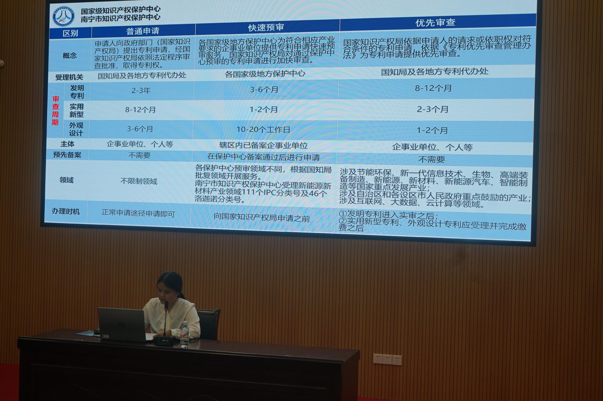 活动中,南宁市知识产权保护中心预审服务部工作人员赵梓君老师详细介绍了专利快速预审业务,并针对案件提交流程及常见问题进行解析,帮助师生明晰专利申请的关键环节。广西咕咕狗知识产权代理有限公司李兰经理进行了专利优先审查及相关流程培训,广西咕咕狗专利代理事务所执业专利代理师朱志宽则围绕专利技术交底书撰写提供了专业指南。现场还设置答疑环节,在场专家老师们一对一解答师生疑问。