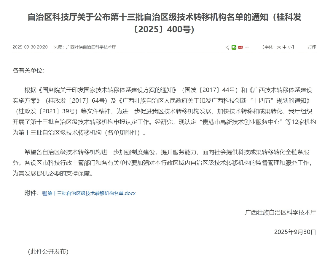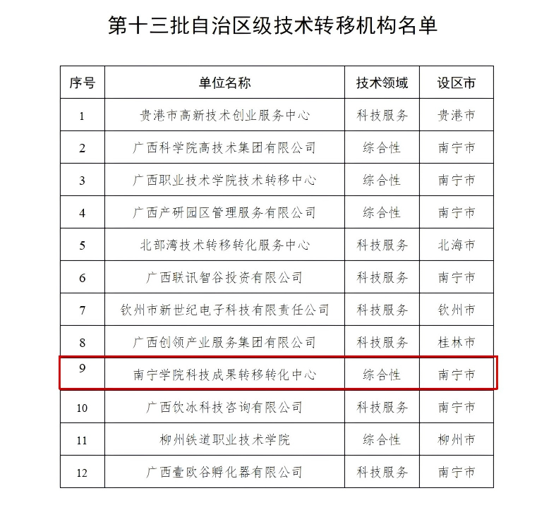 近日,根据《自治区科技厅关于公布第十三批自治区级技术转移机构名单的通知》(桂科发〔2025〕400号),南宁学院科技成果转移转化中心被认定为第十三批自治区级技术转移机构。
