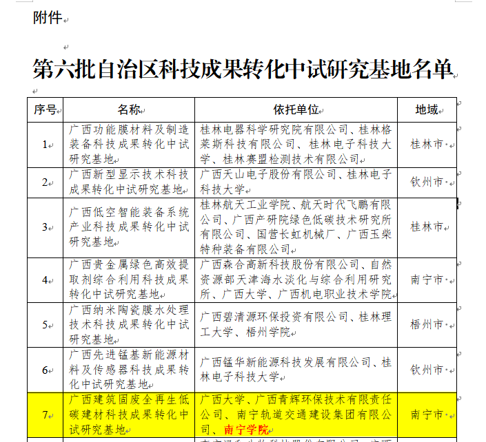 近日,广西壮族自治区科学技术厅发布《自治区科技厅关于公布第六批自治区科技成果转化中试研究基地名单的通知》(桂科发〔2025〕413号),学校携手广西大学、广西青辉环保技术有限责任公司、南宁轨道交通建设集团有限公司联合申报的“广西建筑固废全再生低碳建材科技成果转化中试研究基地”成功获批,这标志着学校在科技成果转化与产学研协同创新领域迈出关键步伐。