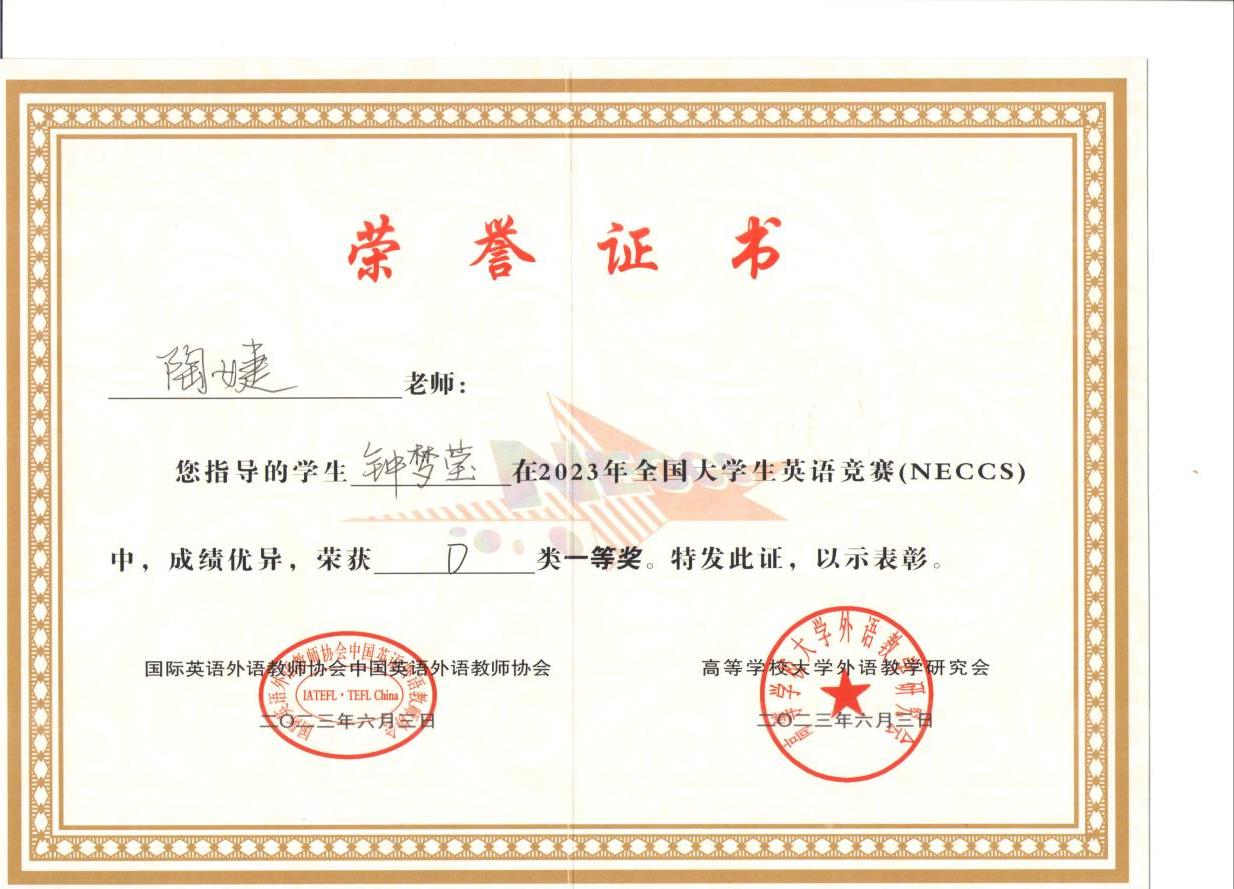 科研反哺教学提高学生的逻辑思维能力。经过调查,80%以上的学生认为自己的自主学习、团队合作和文化素养得到显著提升。在“做中学”的过程中,学生从“不敢开口”发展可以结合自己的艺术设计专业知识和工艺作品创作“用外语说中国故事”短视频来向海内外传播中华优秀文化。指导学生获大学生英语竞赛区级一等奖、英语阅读竞赛区级三等奖、中国国际互联网+创新创业大赛区级银奖、铜奖、挑战杯创业大赛区级铜奖。