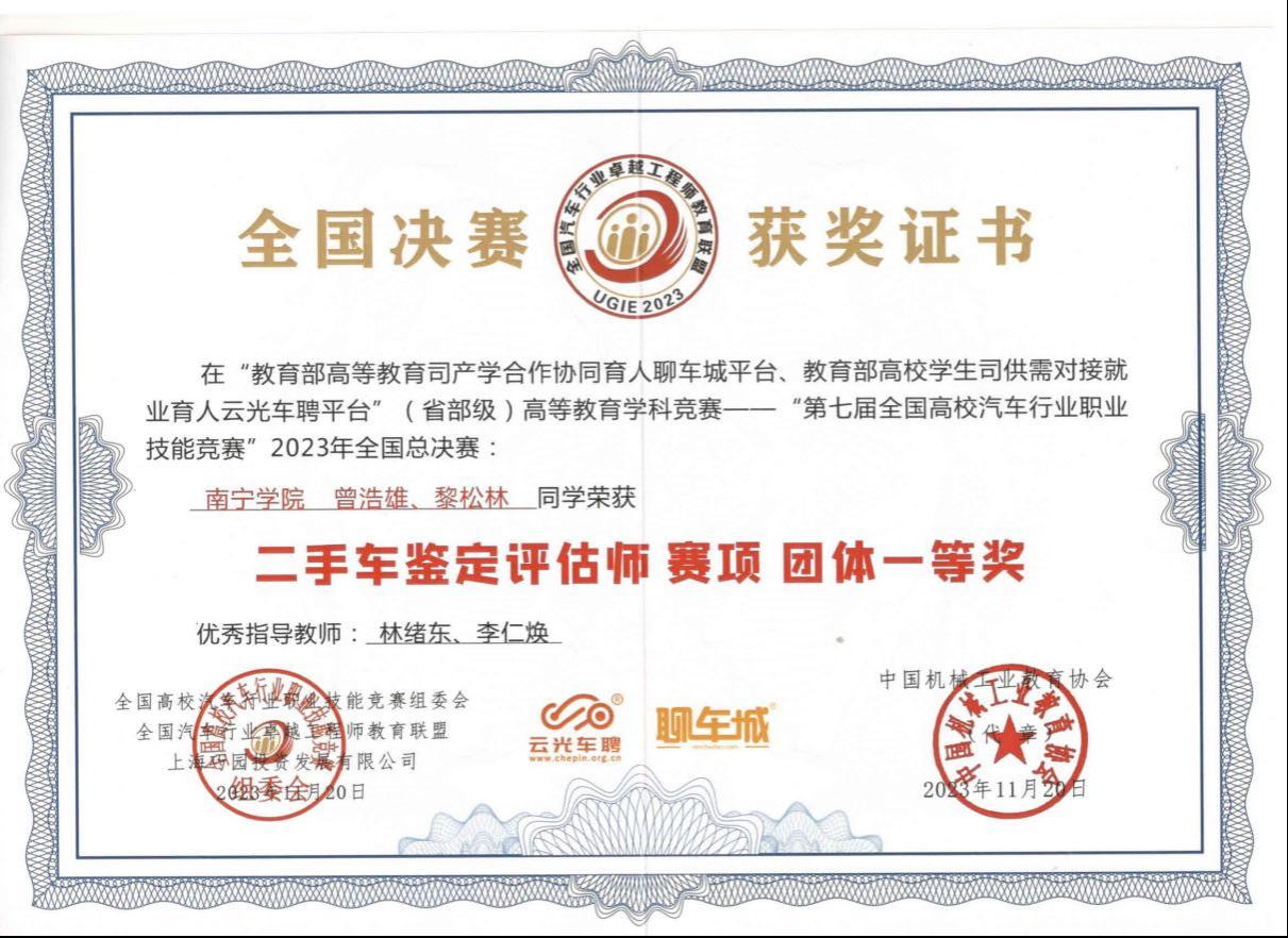 2020级汽车服务工程学生在“教育部高等教育司产学合作协同育人聊车城平台、教育部高校学生司供需对接就业育人云光车聘平台”(省部级)高等教育学科竞赛--“第七届全国高校汽车行业职业技能竞赛”2023年全国总决赛获团体一等奖2个、二等奖3个、三等奖5个,成绩突出。