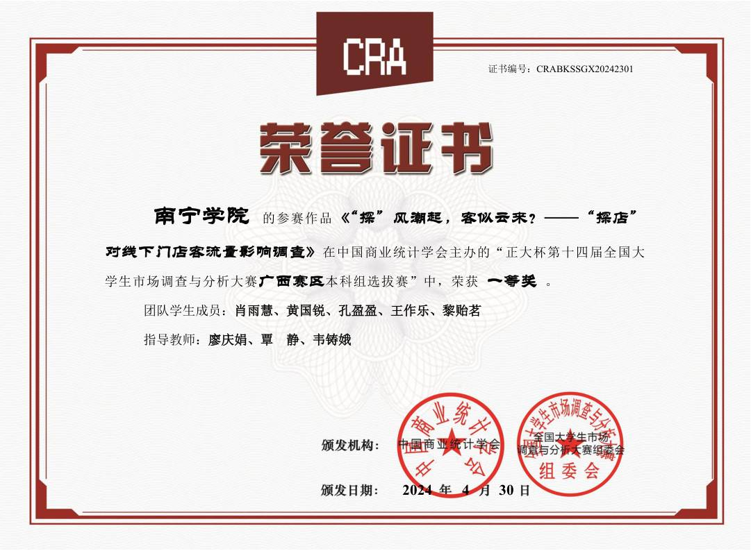 教师利用科研项目“分数阶控制”、“群论研究”及“金融衍生品定价”等研究项目的研究方法、研究思路,指导学生参加各类学科竞赛,取得了显著成绩。例如,指导学生在市场调研大赛中荣获广西一等奖1项,以及在全国大学生数学建模竞赛中分别获得广西一等奖和二等奖各1项。锻炼了学生的团队协作和问题解决能力,还提升了他们的自信心和竞争力。