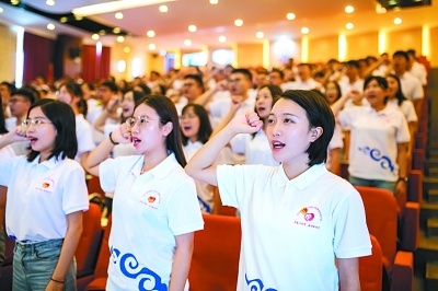 把高校意识形态工作落到实处,要做到主渠道和广覆盖并重,做好社会实践等工作,实现春风化雨、润物无声的教育效果。图为参与志愿服务西部计划的大学生志愿者在出征仪式上宣誓。新华社发