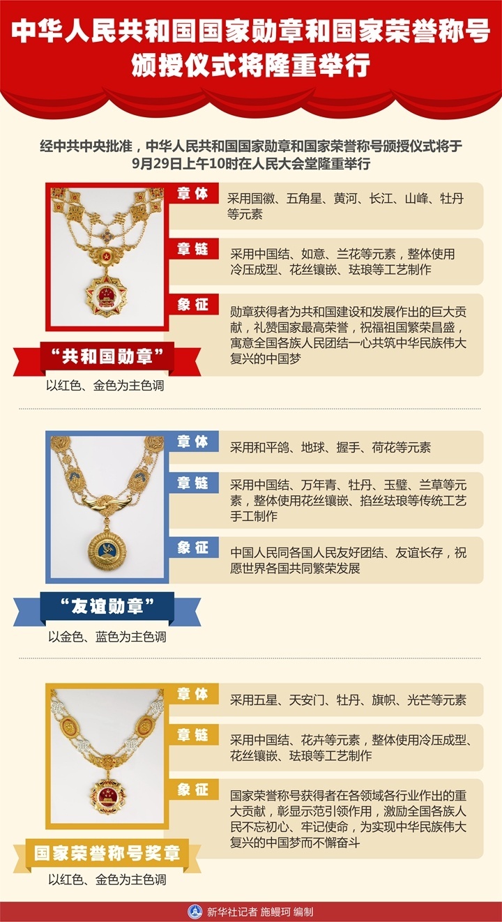 经中共中央批准,中华人民共和国国家勋章和国家荣誉称号颁授仪式将于9月29日上午10时在北京人民大会堂隆重举行。 这是“友谊勋章”。 新华社发