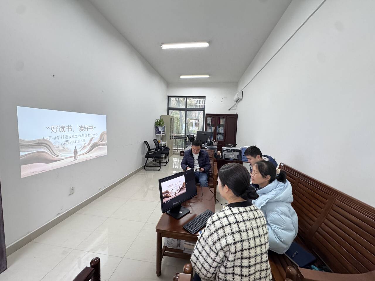 2025年11月5日上午,科研与学科建设处党支部以“读好书,好读书”为主题,举办了一场读书分享会,科研与学科建设处党支部全体党员与入党积极分子参加。本次活动以学校2025年度校长推荐书单的5本优质书目进行阅读分享。分享环节中,党员同志与入党积极分子结合自身岗位职责,分享读书心得与实践思考。