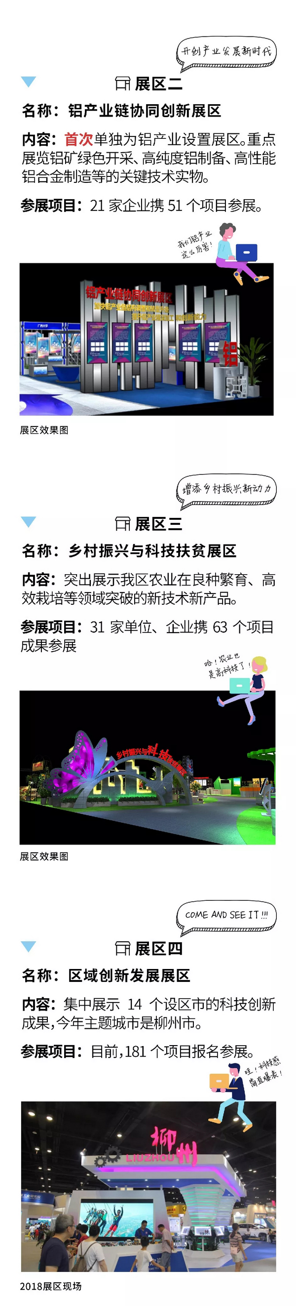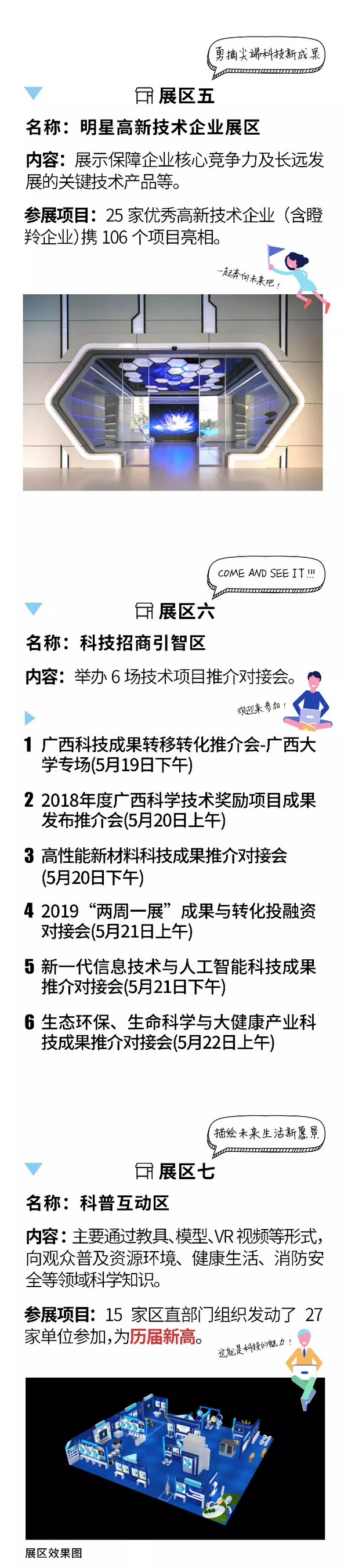今年的“两周一展”将于5月19日至26日在南宁国际会展中心举行,预计超过680家企业及机构带来1300个项目参展。现场将会集中展示全面落实全区创新支撑产业高质量发展推进大会精神,在科研体制机制改革、创新技术研发转化、创新团队平台建设、科技招商引资引智、科学知识普及宣传等方面取得的新进展、新成效、新突破。按“整体布局、分区布展、重点展示、全面宣传”思路,设置7大展区。