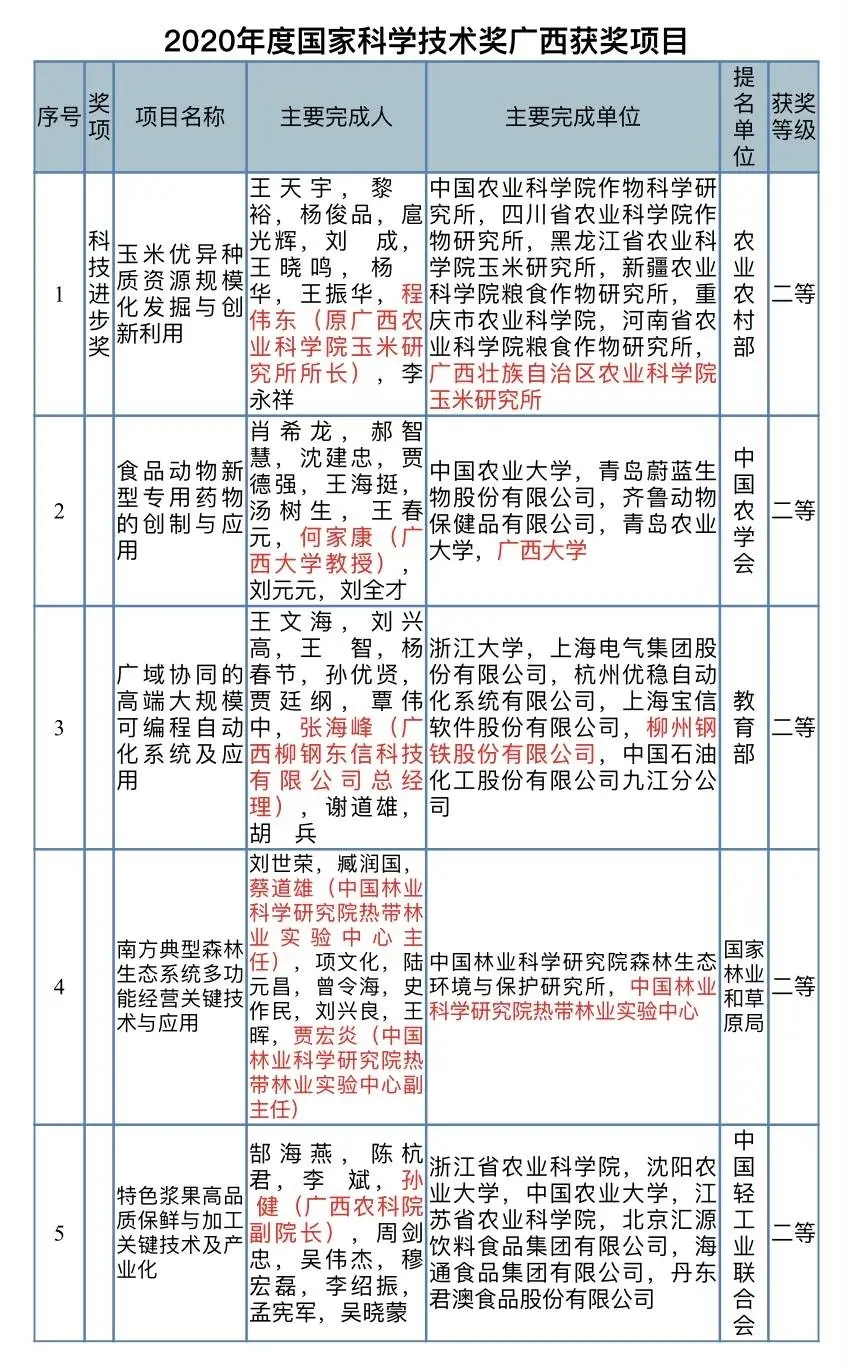 11月4日,南国早报记者从自治区科技厅获悉,在11月3日举行的2020年度国家科学技术奖励大会上,广西获得5项国家科学技术奖二等奖。