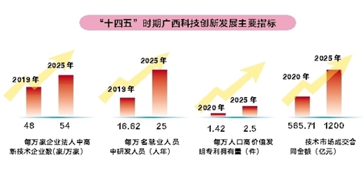“十四五”时期是广西奋力建设新时代中国特色社会主义壮美广西的关键时期,要实现加快发展、转型升级、全面提质,更加需要依靠科技创新驱动高质量发展,不断积蓄发展新动能。为此,自治区政府近日印发实施《广西科技创新“十四五”规划》(以下简称《规划》),绘就了八桂创新发展路线图。记者对《规划》进行了梳理。