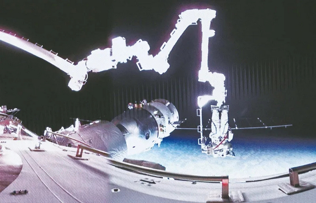 2024年3月2日,神舟十七号航天员乘组第二次出舱活动取得圆满成功,这是我国航天员首次完成在轨航天器舱外设施的维修任务。图为在北京航天飞行控制中心拍摄的神舟十七号航天员江新林在空间站机械臂的辅助下进行舱外作业。 新华社记者 李贺/摄