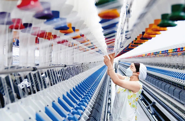 发展新质生产力不是忽视、放弃传统产业,要用新技术改造提升传统产业,积极促进产业高端化、智能化、绿色化。图为2024年3月12日,在山东腾峰纺织科技有限公司,工作人员在智能化纺纱设备前忙碌。 新华社记者 郭绪雷/摄