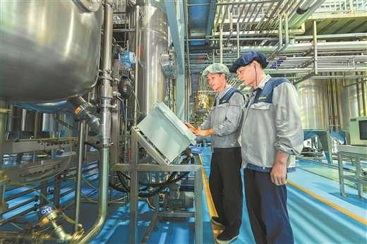 莱茵生物公司合成生物车间内,工作人员正在检查生产仪器运行情况。 广西云-广西日报记者古秀芳 通讯员王庆蓉/摄